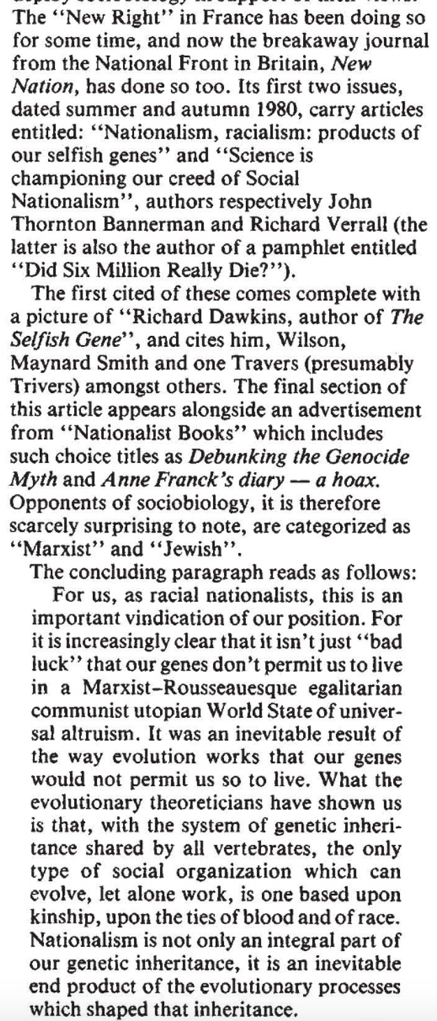 For us, as racial nationalists, [The Selfish Gene] is an important vindication of our position. … What the evolutionary theoreticians [like Dawkins] have shown us is that the only type of social organization which can evolve, let alone work, is one based upon kinship, upon the ties of blood and of race.