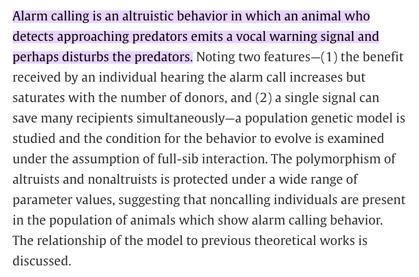 For a specific example of how this works, take vervet monkeys who give alarm calls when predators are nearby to alert the other monkeys around them. This act draws attention to themselves in order to save everyone else.