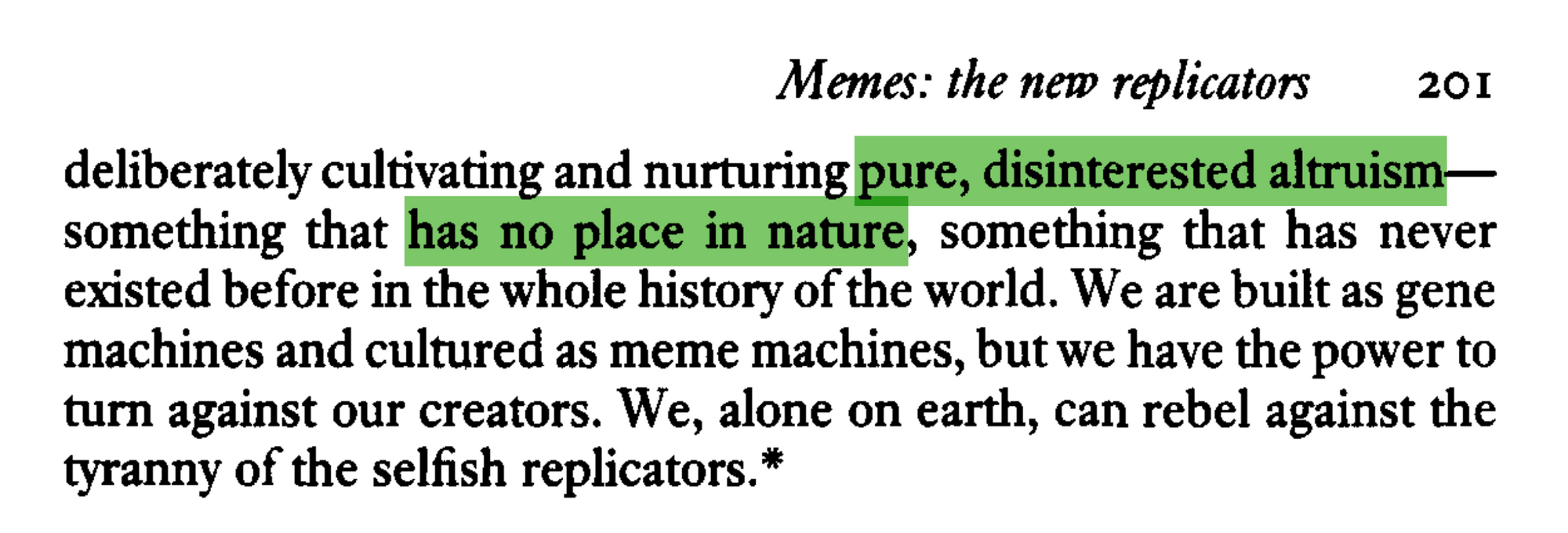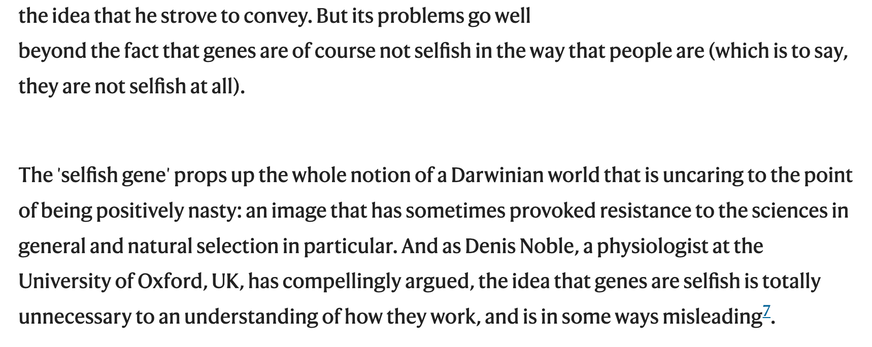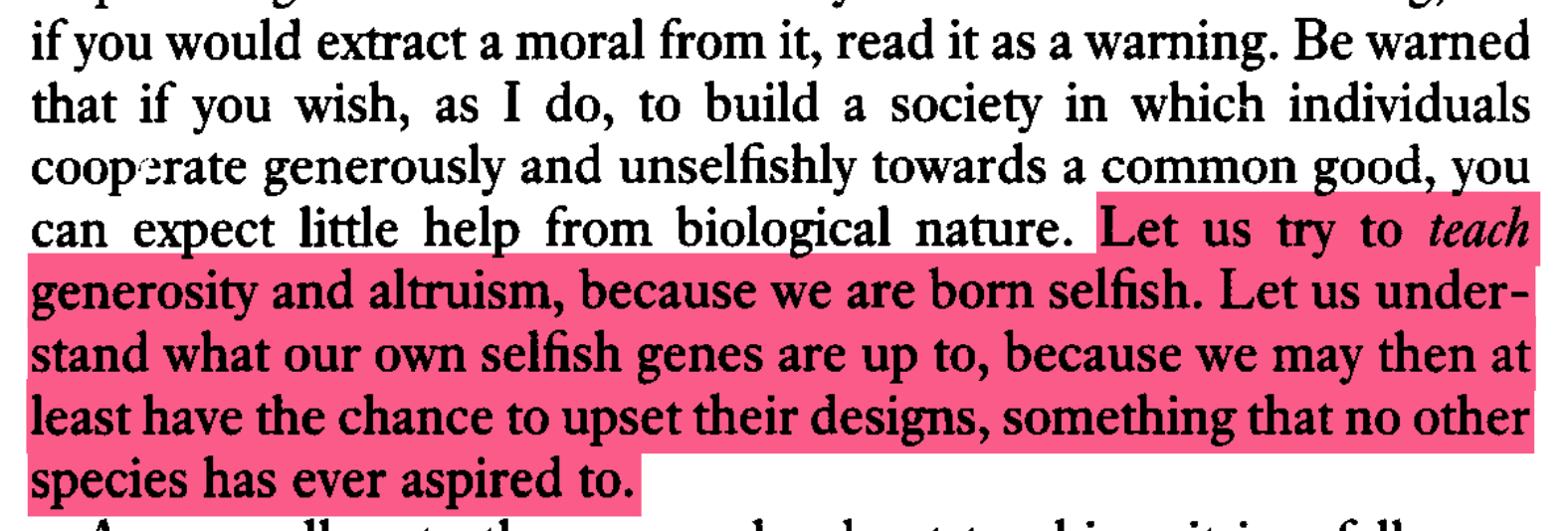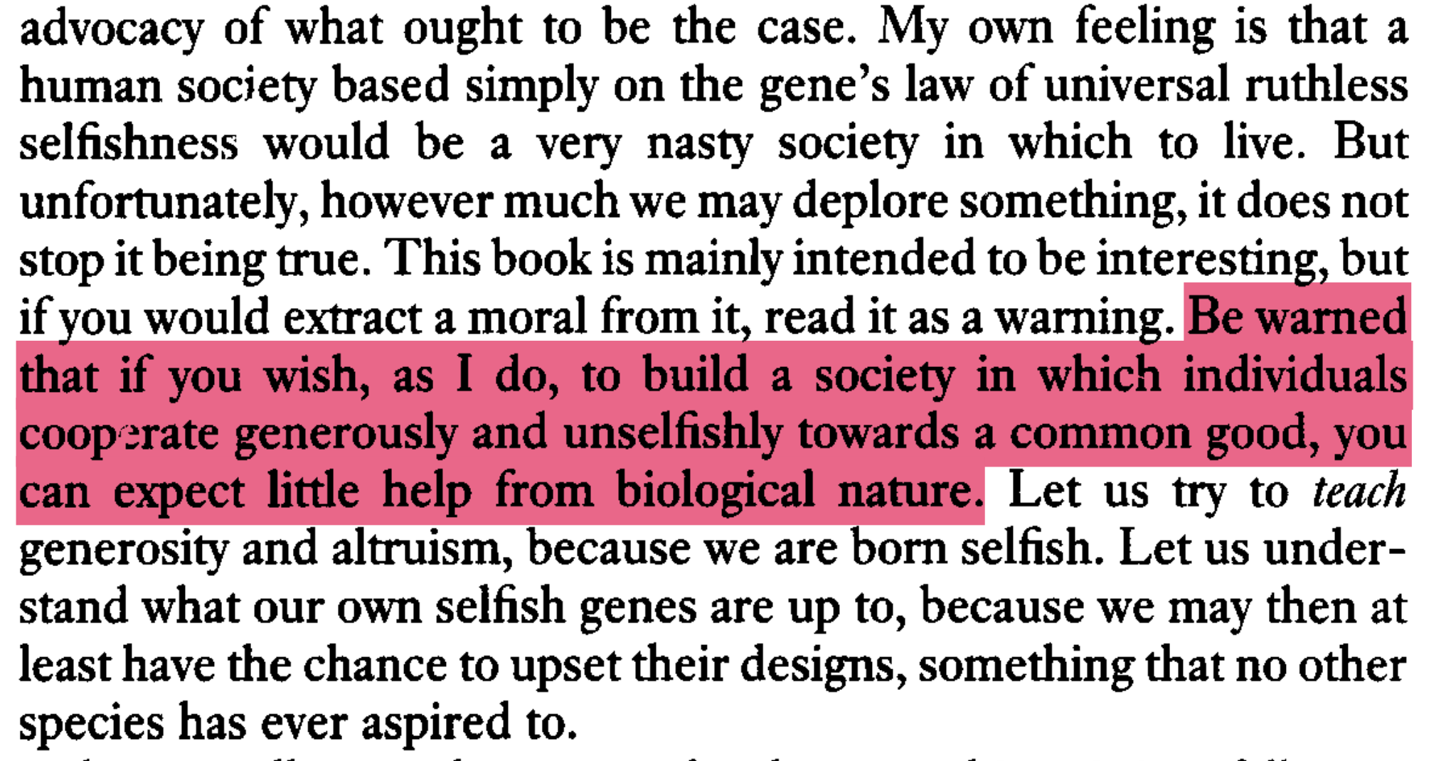 Also this argument only makes any sense if you believe that we humans are somehow fundamentally different from nature. Dawkins is essentially positing two different sets of rules for biology. Nature is selfish and has to obey it's selfish programming, but we humans somehow have agency to overcome these selfish tendencies. Where on Earth does this come from? Are we really that different from other organisms?