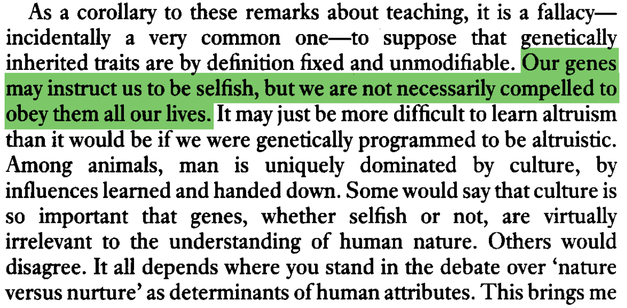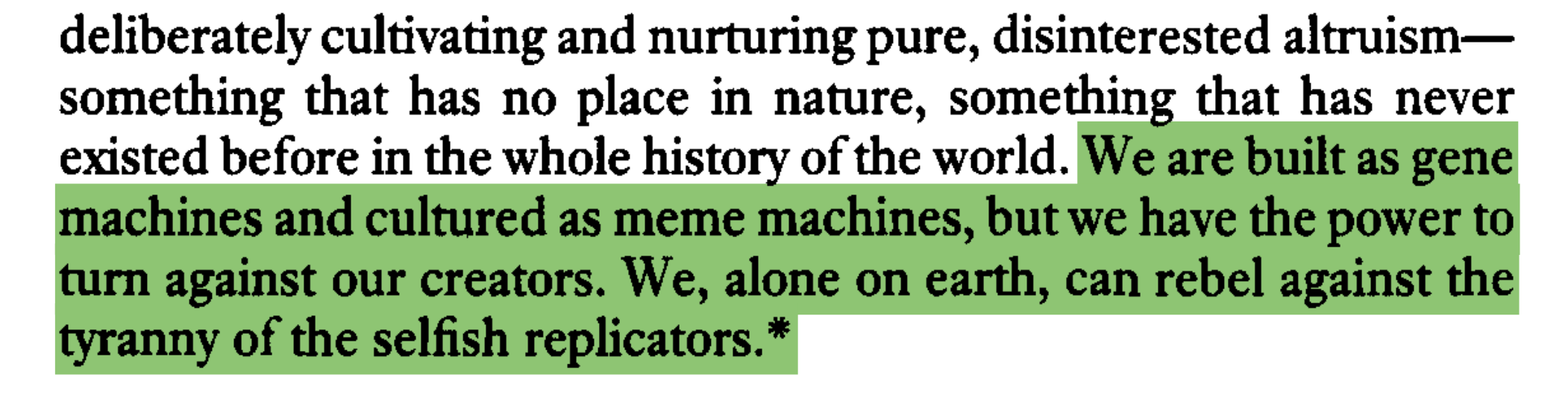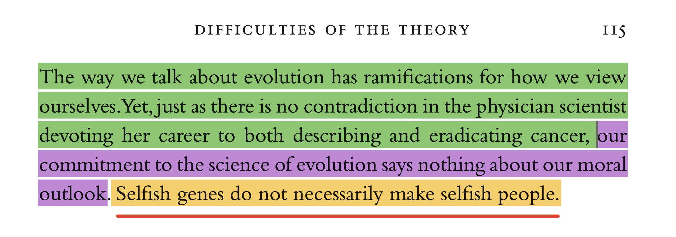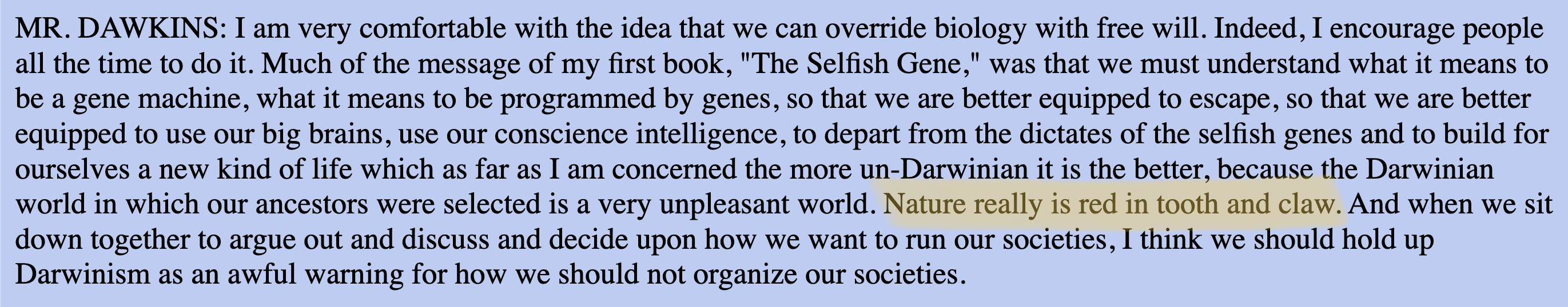 Also this argument only makes any sense if you believe that we humans are somehow fundamentally different from nature. Dawkins is essentially positing two different sets of rules for biology. Nature is selfish and has to obey it's selfish programming, but we humans somehow have agency to overcome these selfish tendencies. Where on Earth does this come from? Are we really that different from other organisms?