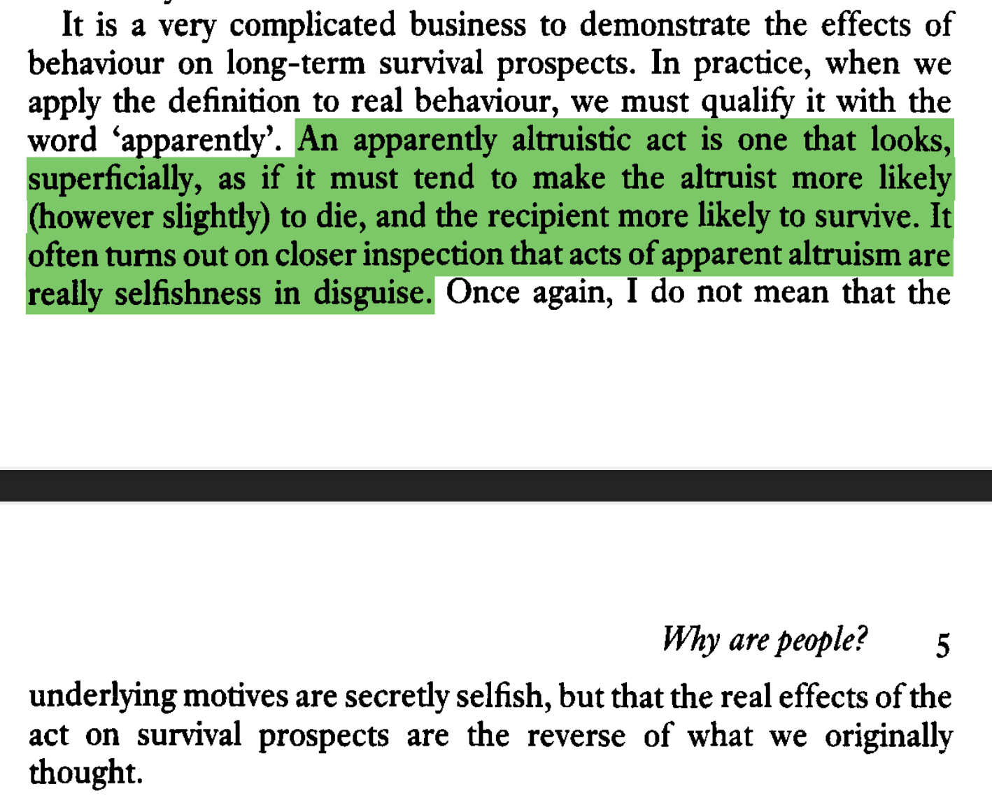 Dawkins argues that because of the power of indirect reproduction, the apparent altruism of individuals is really just the outcome of the selfish interests of genes.