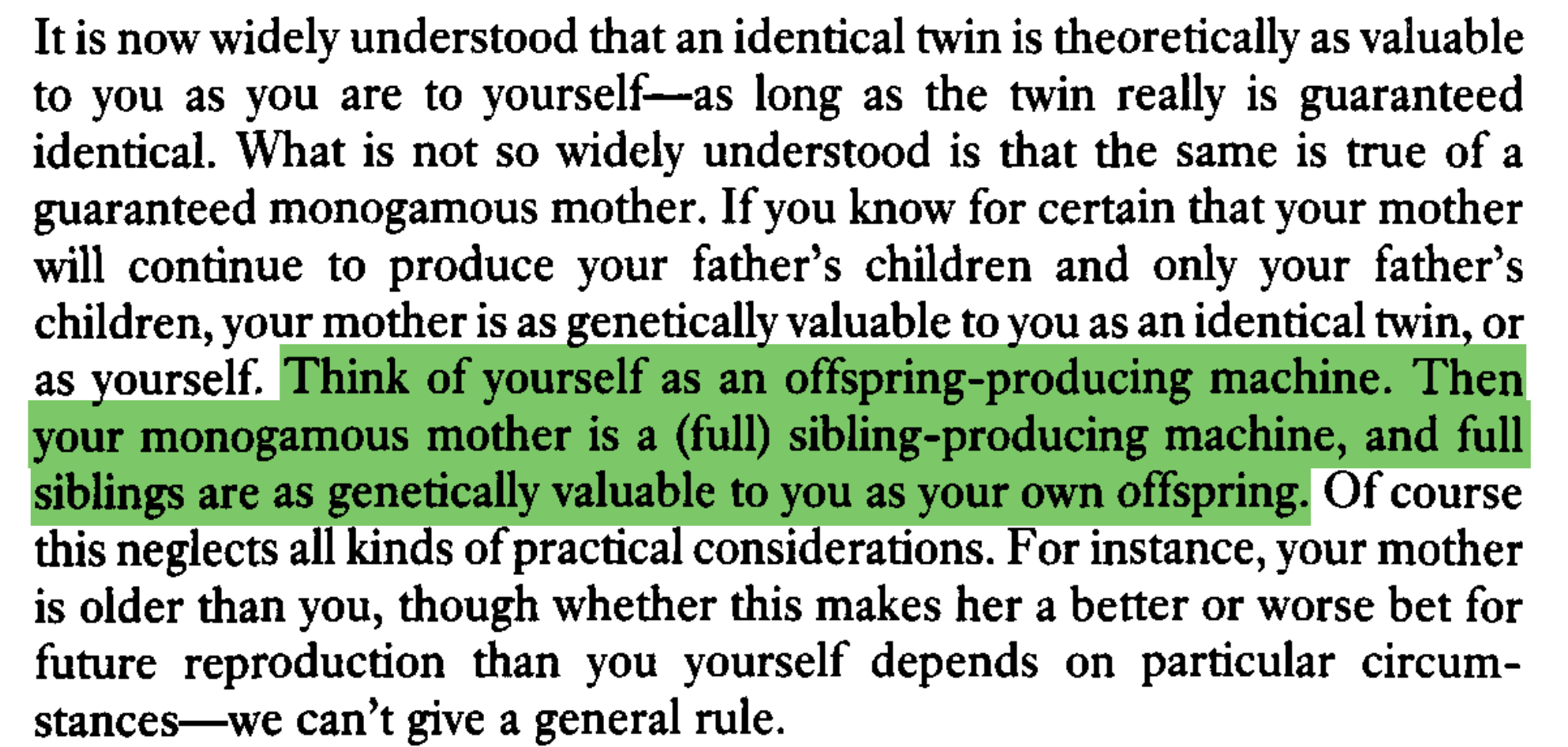 The concept at the core of The Selfish Gene is known as kin selection and it relies on the simple observation that you share just as many genes with your brothers and sisters as you do with your own children. So from a gene's eye view, helping your mother to make more of your siblings and raising them as if they were your own is just as good as reproducing and caring for your own kids.
