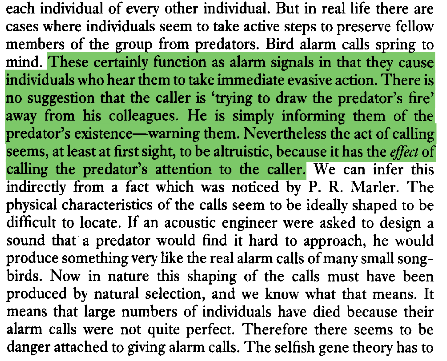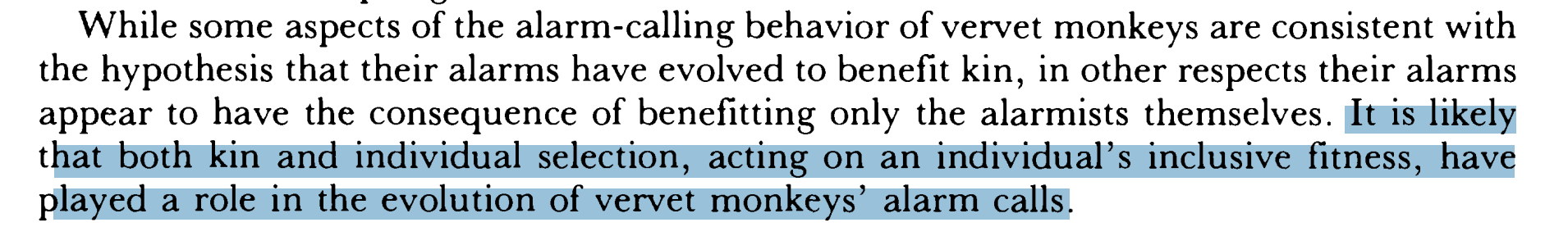 And if one monkey gives an alarm call in a group of highly related monkeys, it is likely that she will save several copies of the gene even if she dies. So the gene is really just acting selfishly to maximise the number of copies of itself that exist. It’s no longer an altruistic behaviour of monkeys acting for the good of the group.
