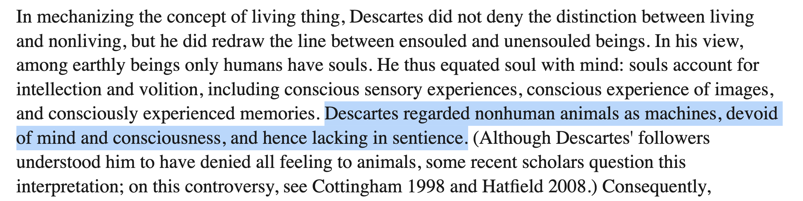 This is argument also goes back to Descartes positing that humans are the only creatures that have souls and all other life are just mindless automata.