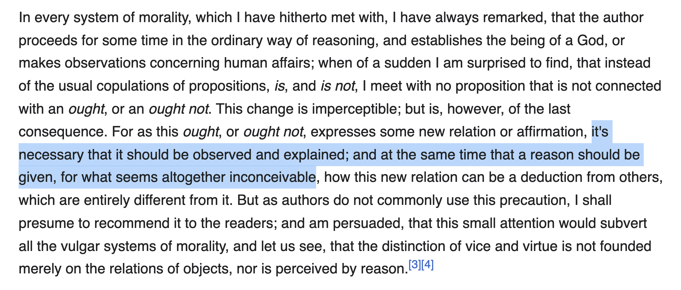 In Hume's original articulation, all he is saying is that to pass from a fact to a value, you need additional assumptions that have to be explained.