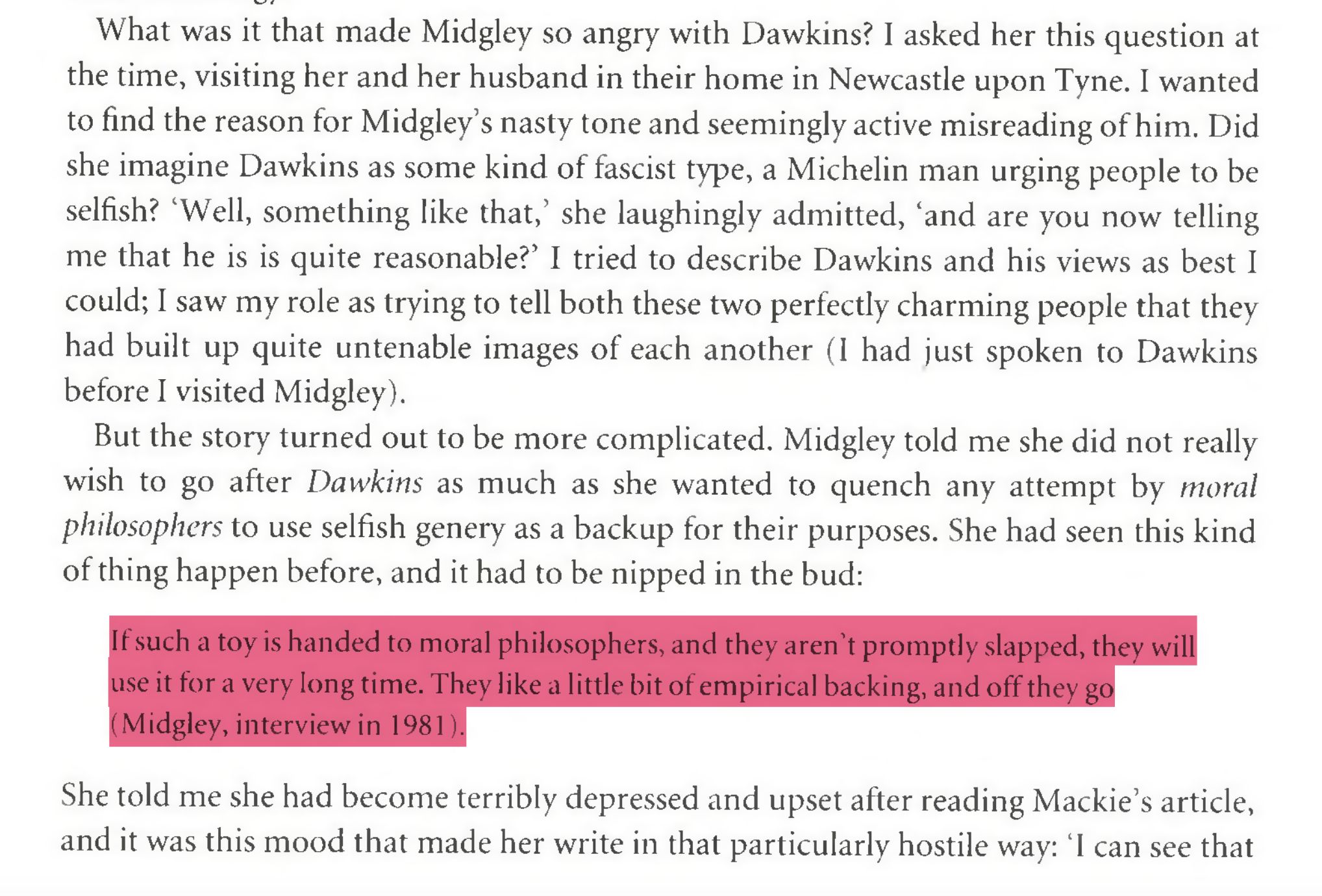 If such a toy [like The Selfish Gene] is handed to moral philosophers, and they aren’t promptly slapped, they will use it for a very long time. They like a little bit of empirical backing, and off they go.