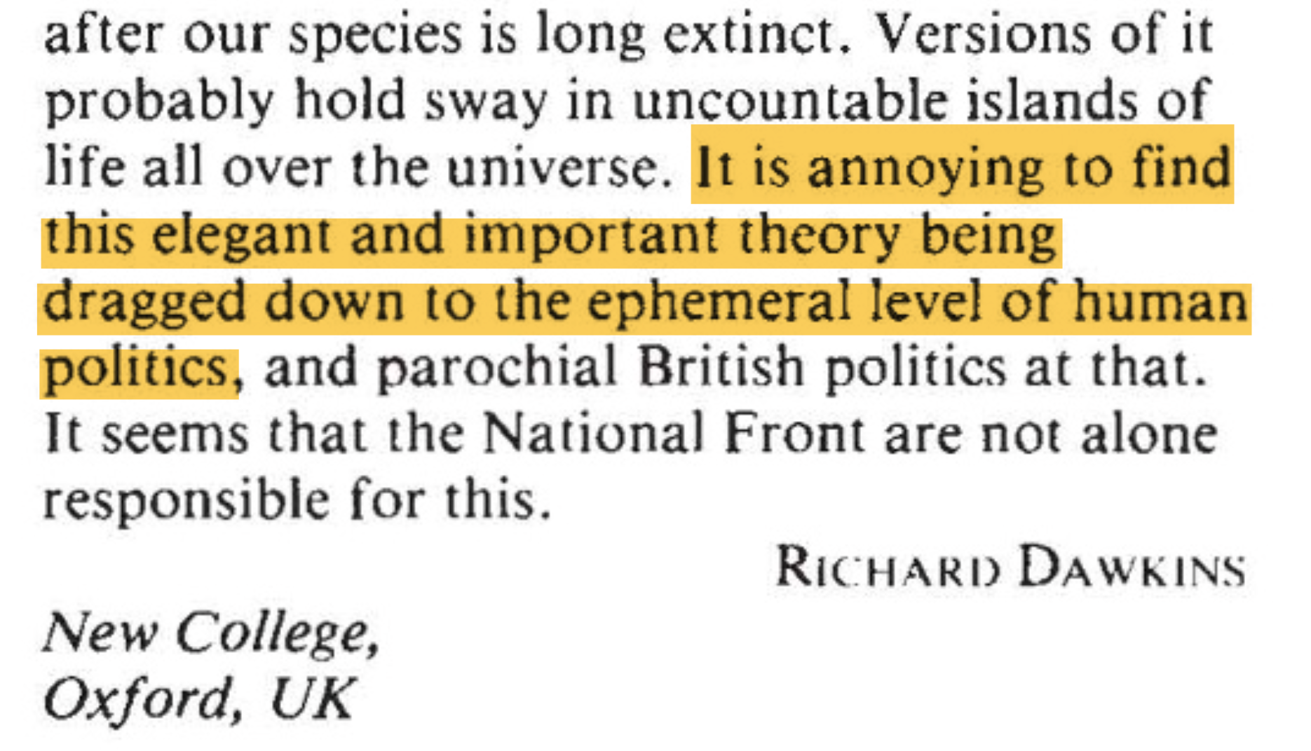 Dawkins admits that he overlooked the possibility that people would use The Selfish Gene to promote fascism and called it "annoying" that kin selection was being "dragged down to the ephemeral level of human politics."