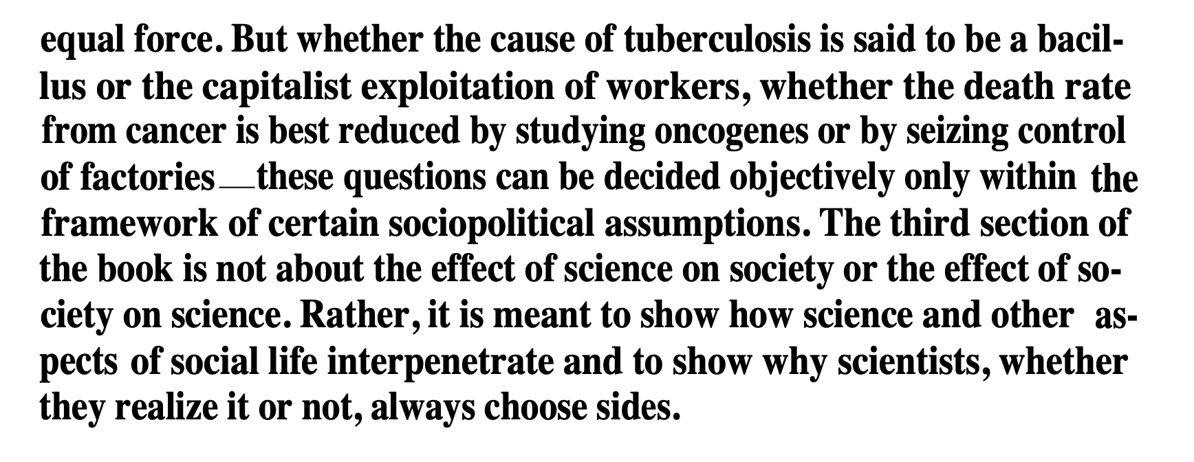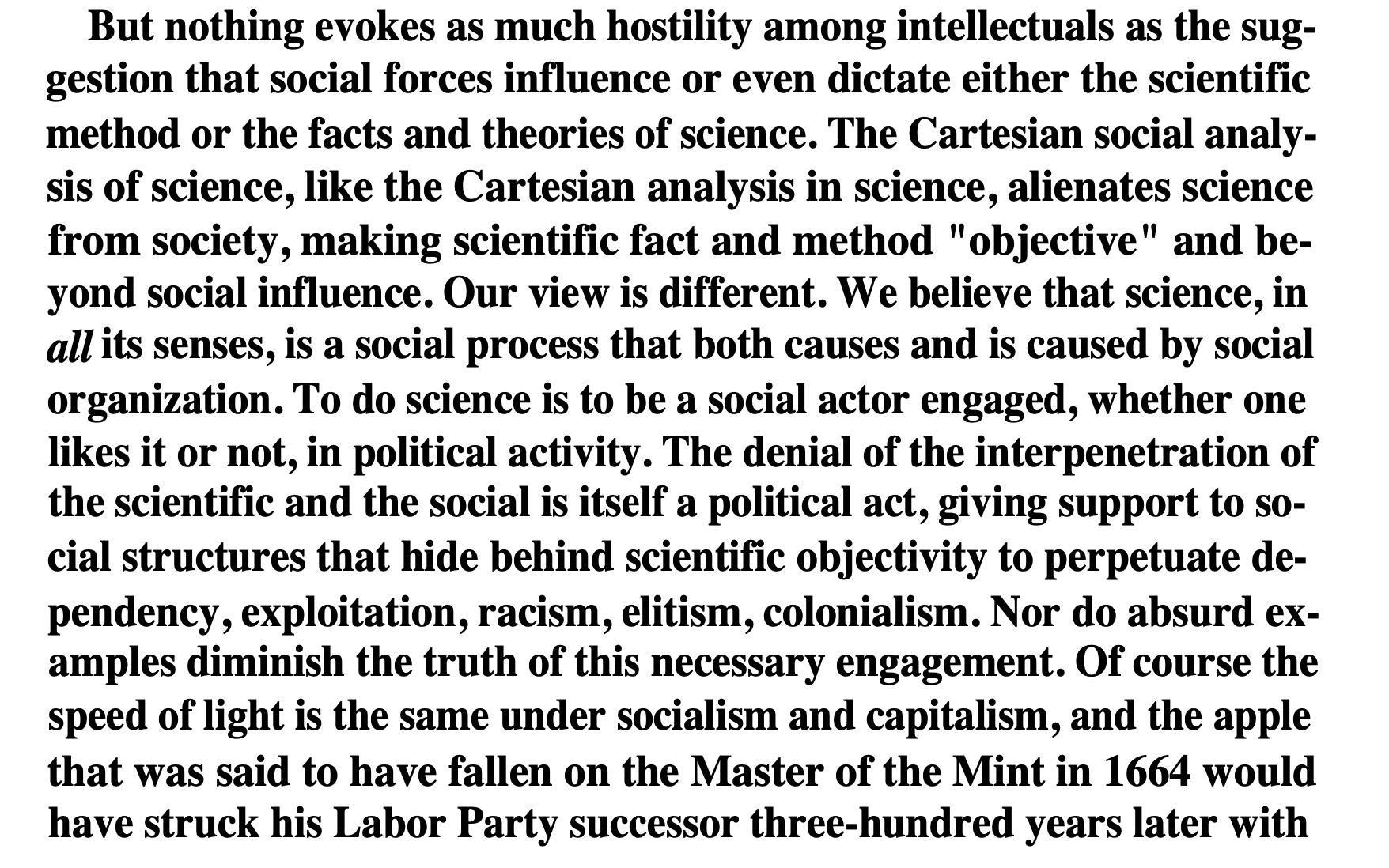 We believe that science, in all its senses, is a social process that both causes and is caused by social organisation. To do science is to be a social actor engaged, whether one likes it or not, in political activity. The denial of the interpenetration of the scientific and the social is itself a political act, giving support to social structures that hide behind scientific objectivity to perpetuate … exploitation, racism, elitism [and] colonialism. … Of course the speed of light is the same under socialism and capitalism. But whether the cause of tuberculosis is said to be [bacteria] or the capitalist exploitation of workers, whether the death rate from cancer is best reduced by studying oncogenes or by seizing control of factories — these questions can be decided objectively, only within the framework of certain sociopolitical assumptions.