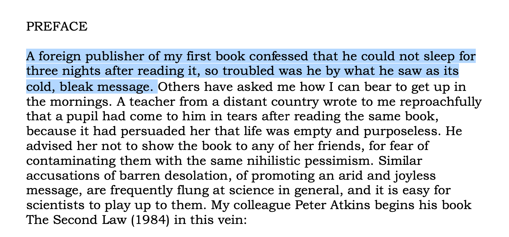 The implications of all this on human nature didn't go unnoticed. Dawkins later wrote that one of his foreign publishers couldn't sleep for three days after reading the book because he was "so troubled by what he saw as its cold bleak message."
