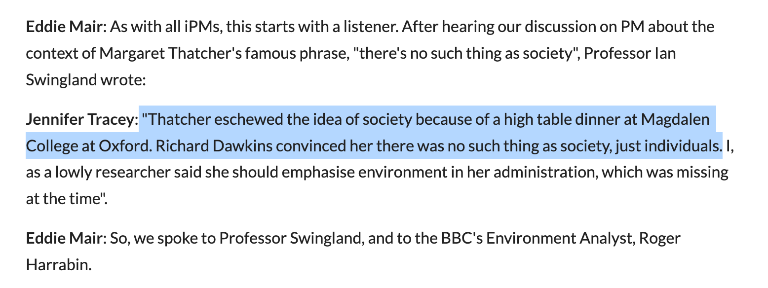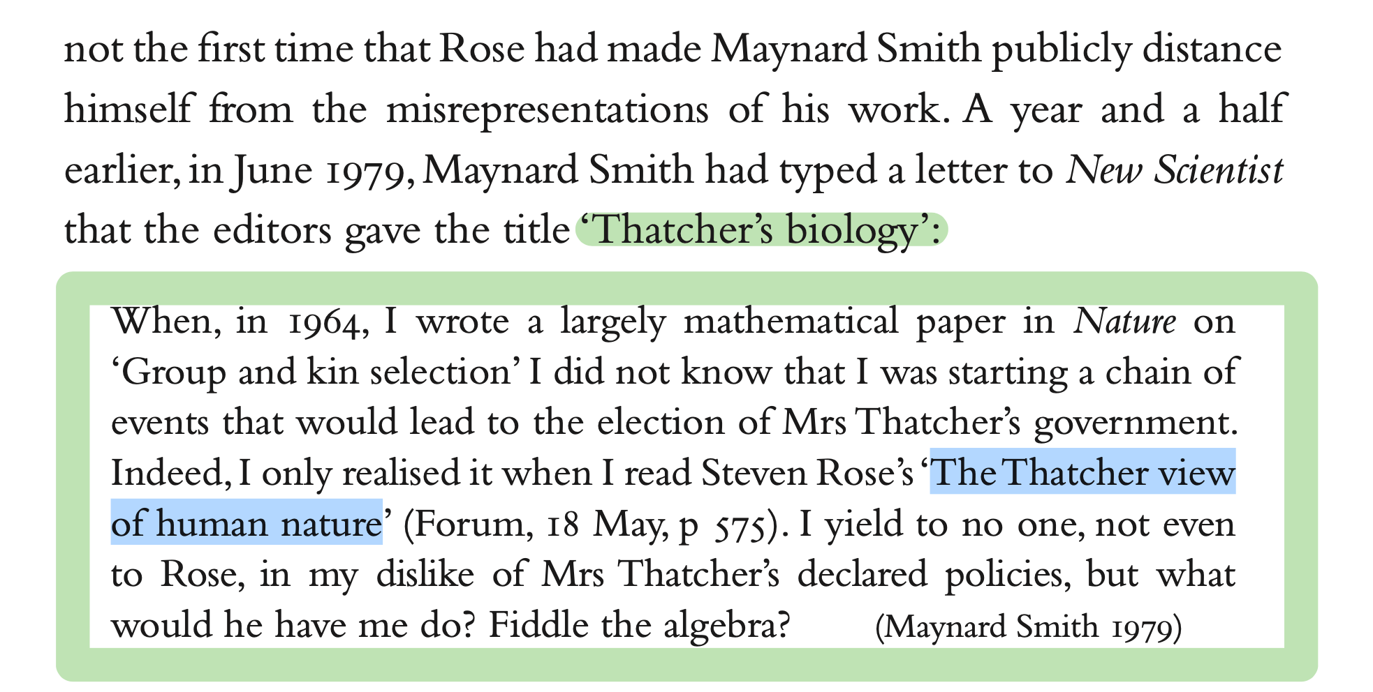 Many also accused Dawkins of indirectly supporting Thatcher's individualistic and conservative politics of the time, by painting biological organisms (and therefore humans too) as innately selfish.