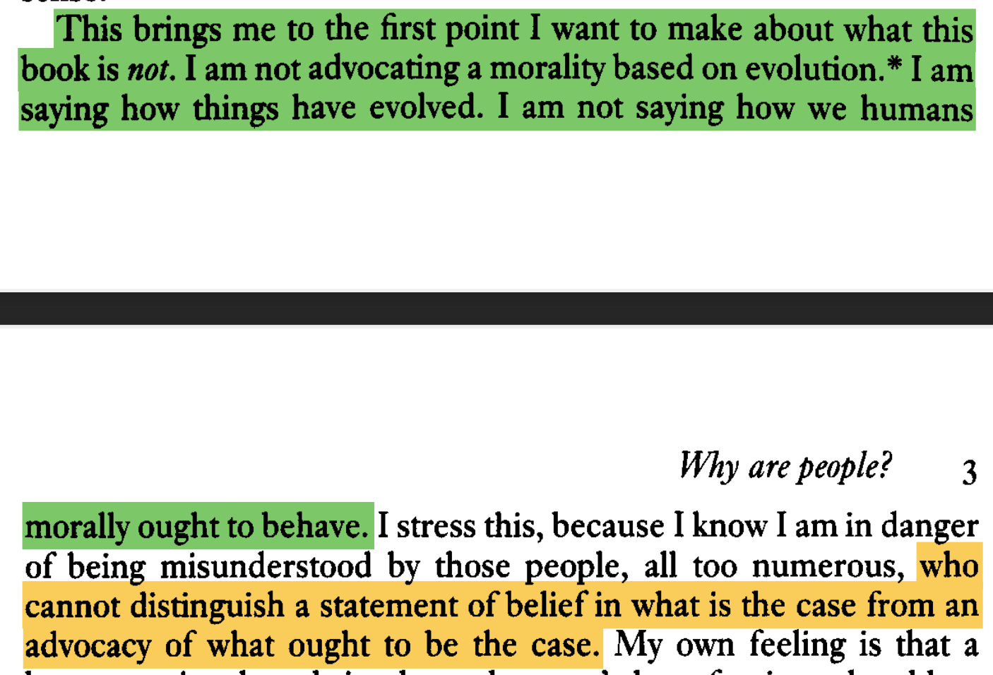 Also I realised this after editing, but seemingly after advocating that is's and ought's are different categories of statements in the paragraph above, he moves to an ought statement a couple sentences later saying that we should teach altruism since we "can expect little help from biological nature" (a very Hobbesian argument as Mary Midgley has described in The Solitary Self). This is moving from an is to an ought!