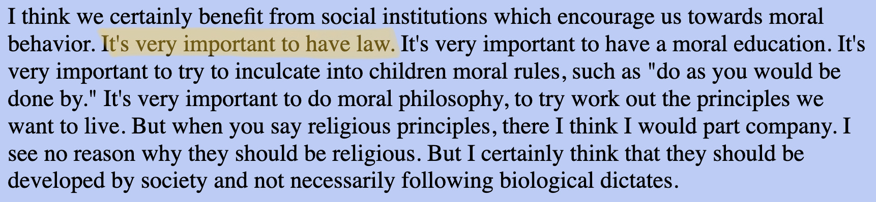 And extending this line of logic a little further you get a similar justification of authority and law (presumably since otherwise we'd all be fighting each other to death). Again, this is reflective of Hobbes' (and T. H. Huxley's) delight in the phrase "nature red in tooth and claw" which Dawkins likes: