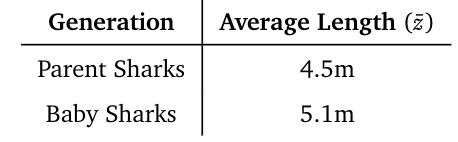 In this case, the average length of sharks has increased in the second generation. So the trait has ‘survived.’ The key value of interest here is the change in average length between the two generations: Δz̄ = +0.6m.