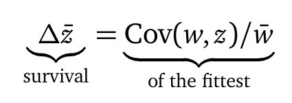 On a more positive note, we have successfully transformed the ambiguity of the phrase ‘survival of the fittest’ into a clear mathematical equation. This representation of natural selection has also proven to be extremely useful. It provides the basis for a number of super important theorems of evolution. The Price equation itself has been suggested as a ‘fundamental theorem of evolution.’